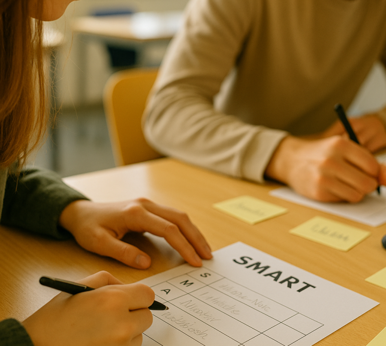 Ein wesentlicher Schritt im Vision Camp ist es, den Jugendlichen zu zeigen, wie sie ihre Träume und Ideen in konkrete und erreichbare Ziele umwandeln können. Mithilfe der bewährten SMART-Methode (Spezifisch, Messbar, Attraktiv, Realistisch, Terminiert) lernen die Teilnehmer, Klarheit über ihre Ziele zu gewinnen und diese so zu formulieren, dass sie motivieren und greifbar werden.